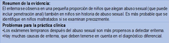 - No hay estudios de buena calidad del eritema anal/perianal comparando niños con historia de abuso sexual por vía anal con niños seleccionados por no abuso.